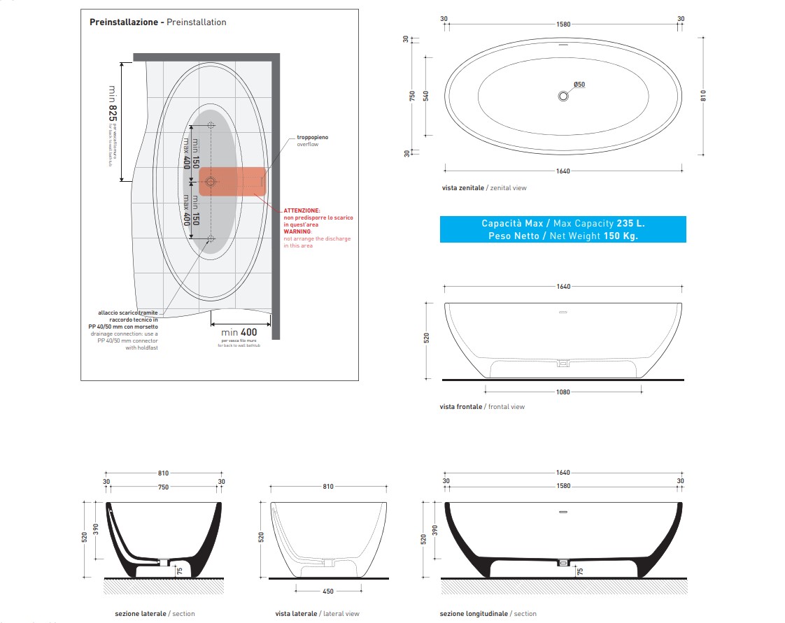 Довжина 165 см, ширина 80 см, висота 52 см. Колір Bianco (білий)Ванна виготовлена з Pietraluce - це сполука гідратованого оксиду алюмінію, діоксиду титану та покрита товстим шаром поліефірної смоли ISo-NPG. Матеріал стійкий до кислот, розчинників та рідких засобів для чищення, має антибактеріальні властивості, негорючий і самозгасаючий. Подряпини або плями видаляються звичайною полірувальною пастою. Для чищення виробів з Pietraluce® слід використовувати м’які тканини та рідкі миючі засоби.В комплекті з сифоном. Накладка зливу виконана в кольорі ванни - Bianco (білий).