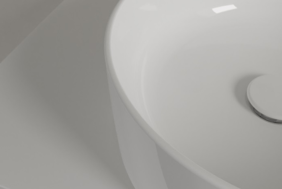 Накладний умивальник Collaro, круглий, діаметр 40 см, White Alpin, без переливу, неполірований. Установка з мінімальною відстанню між задньою частиною умивальника та стіною 50 мм. Глянцевий