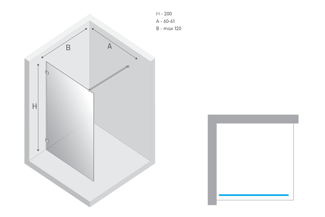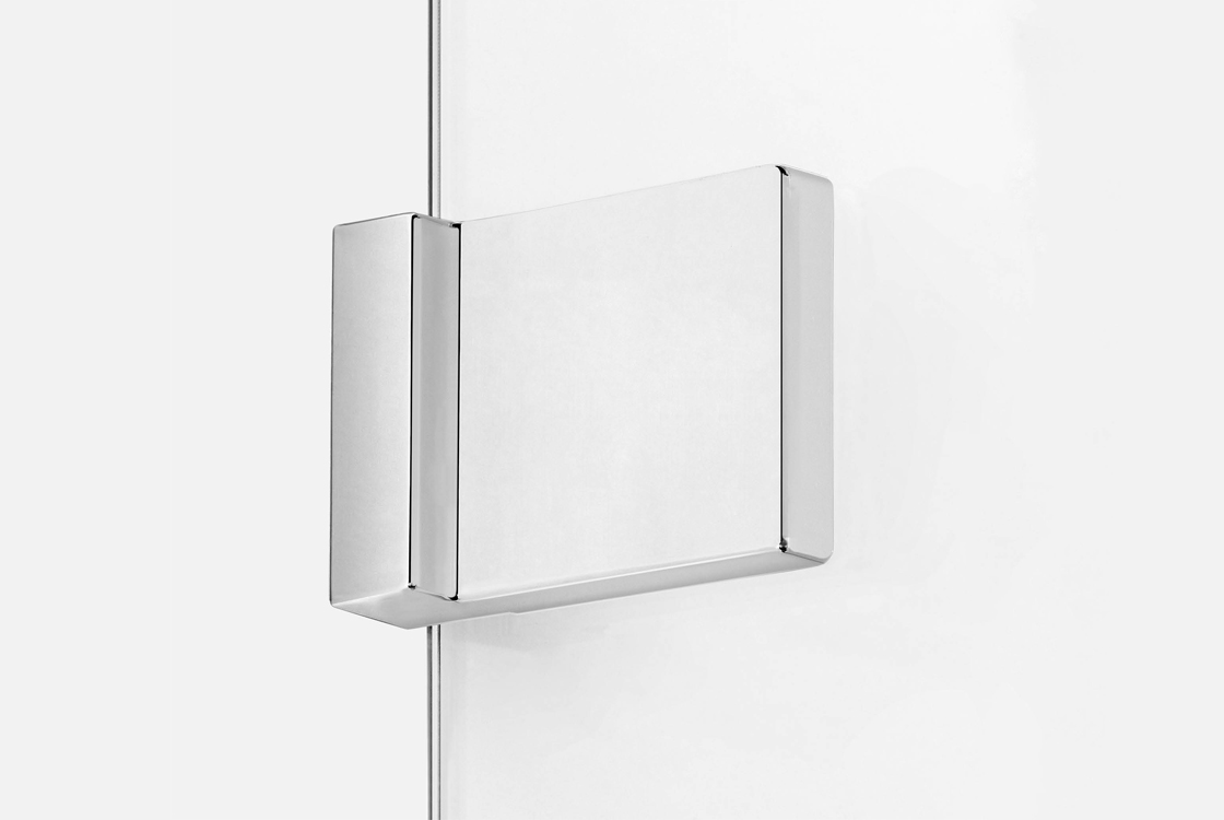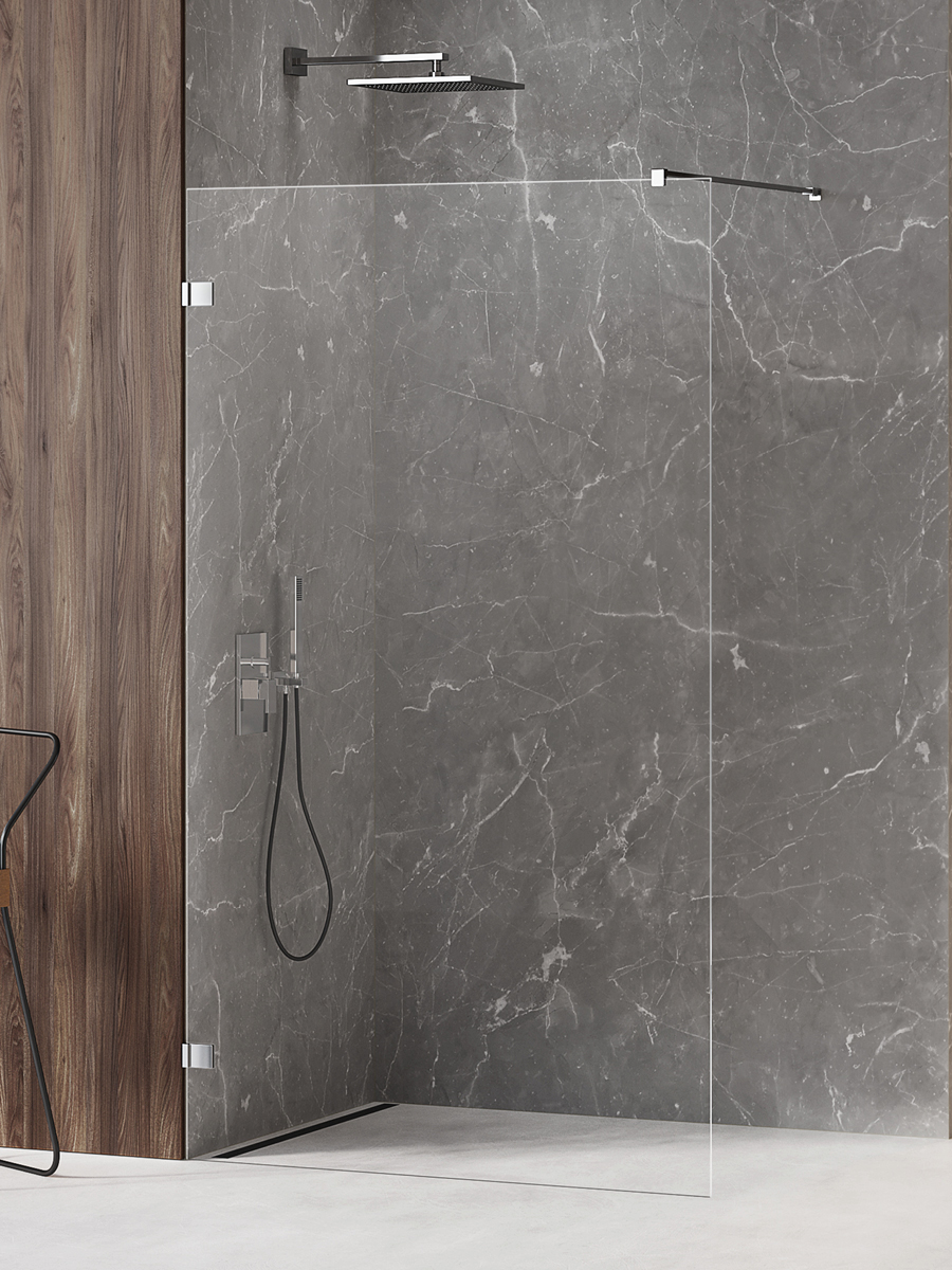 Статична душова перегородка відкритого типу walk in. Безпечне загартоване прозоре скло товщиною 8 мм із захисним покриттям Active Shield. Примикання скла до стіни за допомогою кріплень. Надійну фіксацію скла забезпечує хромований тримач.