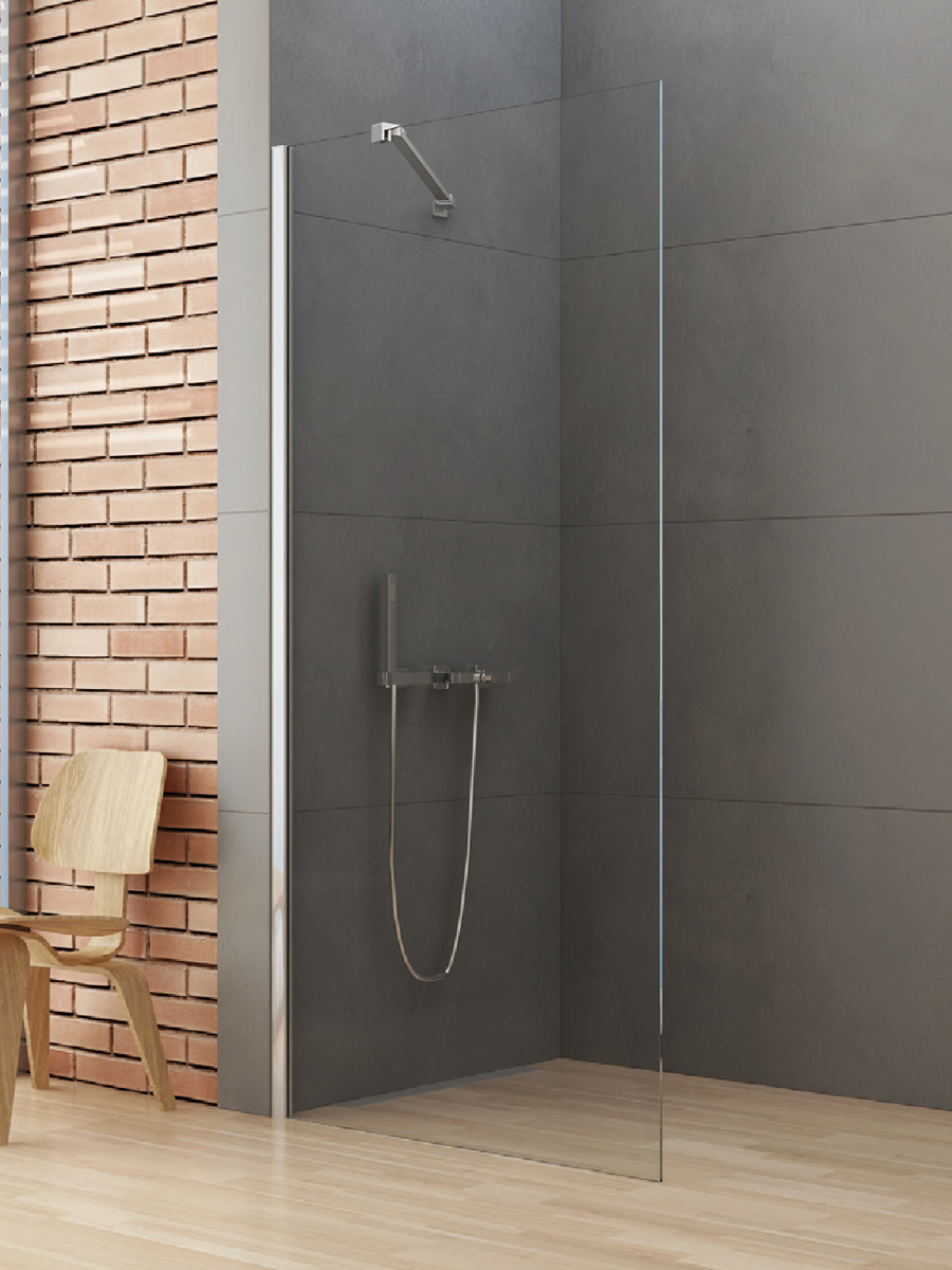 Статична душова перегородка відкритого типу walk in. Безпечне загартоване прозоре скло товщиною 6 мм із захисним покриттям Active Shield. Профільна система монтажу перегородки являє собою класичний спосіб примикання скла до стіни за допомогою алюмінієвого профілю. Надійну фіксацію скла забезпечує рухомий тримач прямокутної форми.