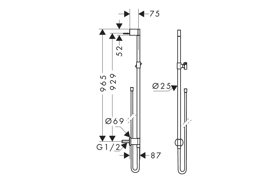 Axor складається з: душової штанги, душового шланга, слайдера, настінного з’єднувача,поворотний з'єднувач запобігає заплутуванню шланга,для душових шлангів з конусною гайкою,довжина труби: 965 мм,діаметр душової штанги: 25 мм,профільна труба кругла,металевий тримач для ручного душу,повзунок плавно регулюється,стінові опори металеві.