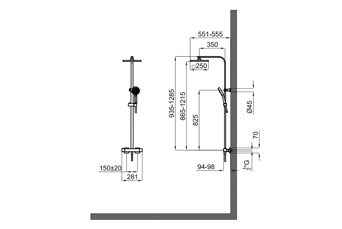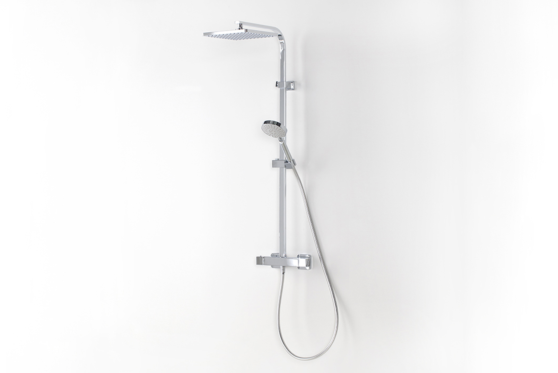 Душова система зі змішувачем з вбудованим термостатом з технологією Savetouch, квадратним верхнім душем, телескопічними направляючими з кронштейном і додатковим ручним душем "JOY S". З підключеннями 1/2 " і відстанню між ними 150±20 мм. Включає зворотний клапан і захисну зупинку при 38ºC. Швидкість потоку при 3 барах ручного душу становить 8,29 л/хв, а душової лійки 8,45 л/хв.