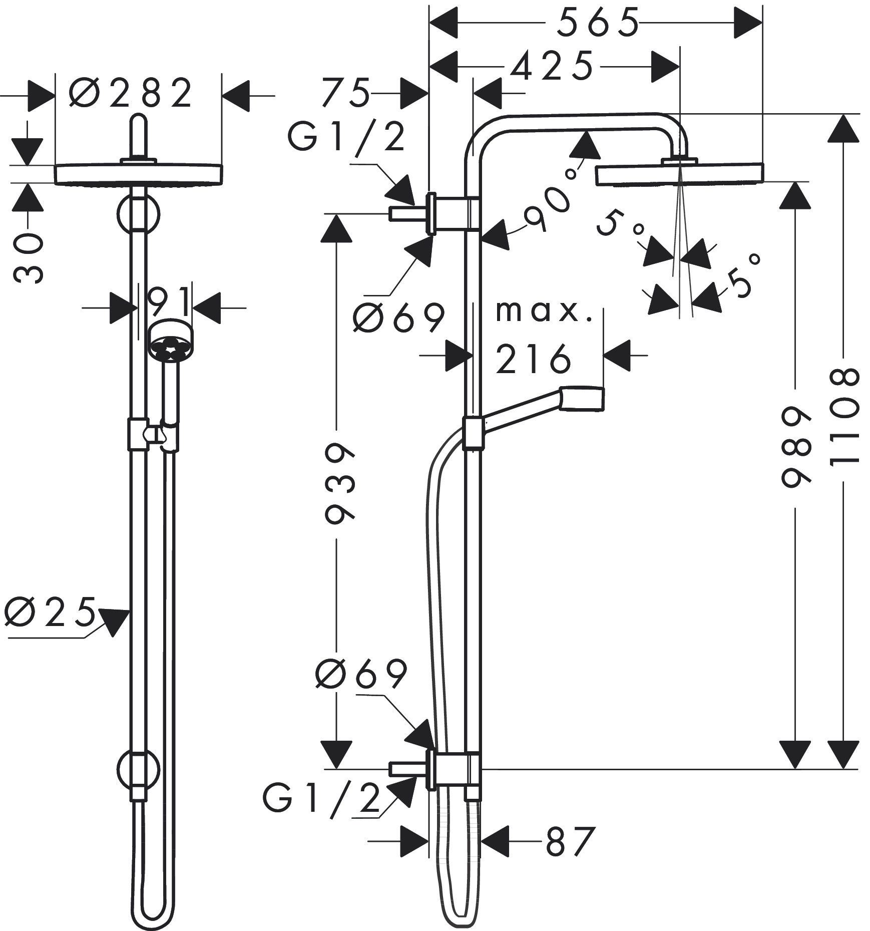 Axor Душова система AXOR One Showerpipe 280 1jet для прихованого монтажу, колір Matt Black (чорний матовий) (48790670)складається з: душової штанги, верхнього душу, ручного душу, душового шланга, тримача для ручного душу, настінного з’єднувача,верхній душ AXOR One 280 1jet, розмір: 280 мм,верхній душ струйного типу: PowderRain і Rain у комбінації,кульовий шарнір: верхній душ регулюється кутом нахилу,кут нахилу тримача душу можна плавно регулювати,потрібен міксер для 2 функцій,максимальна витрата при 3 барах: 12,7 л/хв,ручний душ типу розпилення: PowderRain,витрата ручного душу при 3 барах: 8,3 л/хв,мінімальний тиск потоку: 2 бар,макс. робочий тиск: 10 бар,тип монтажу: прихований,діаметр душової штанги: 25 мм,тримач для ручного душу з регулюванням висоти,поворотний душовий кронштейн,приєднувальний розмір: DN15.