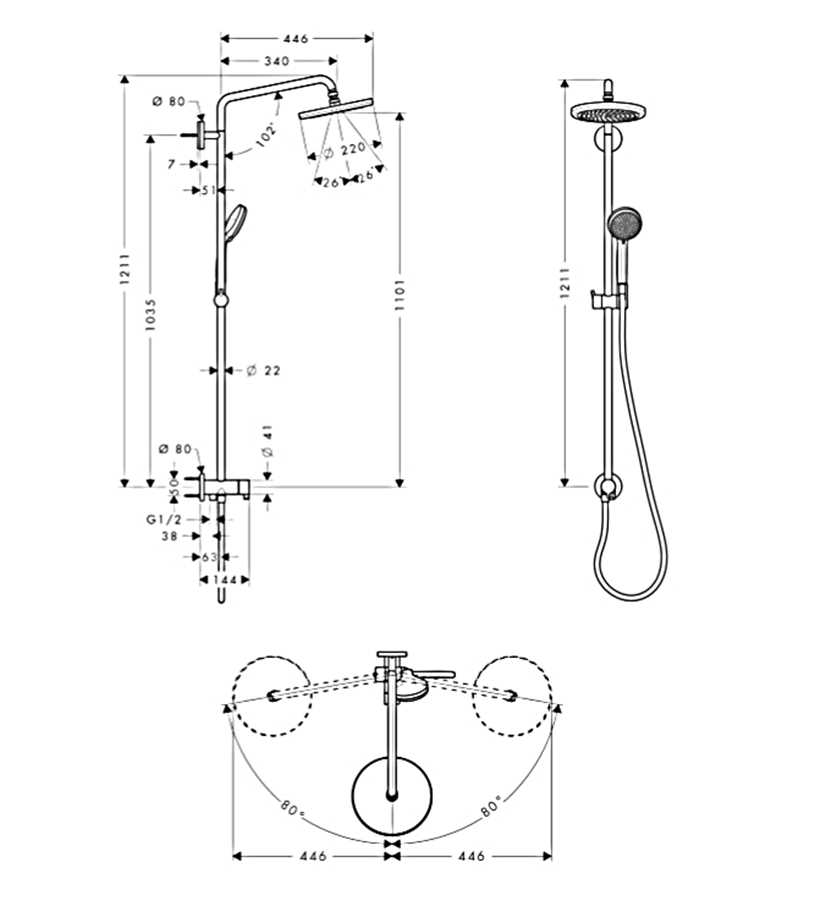 • складається з: верхній душ, ручний душ, шланг для душу, повзунок, штанга для душу