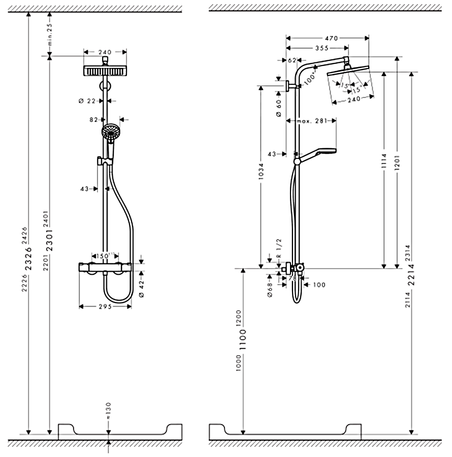 • складається з: верхній душ, ручний душ, термостат для душу, душовий шланг, повзунок, штанга для душу