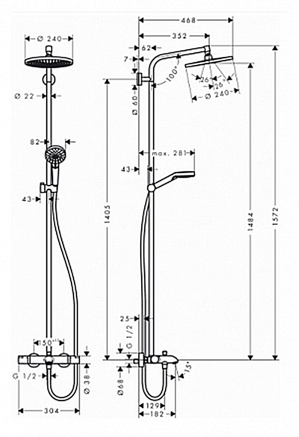 • складається з: верхній душ, ручний душ, термостат для ванни, душовий шланг, повзунок, штанга для душу