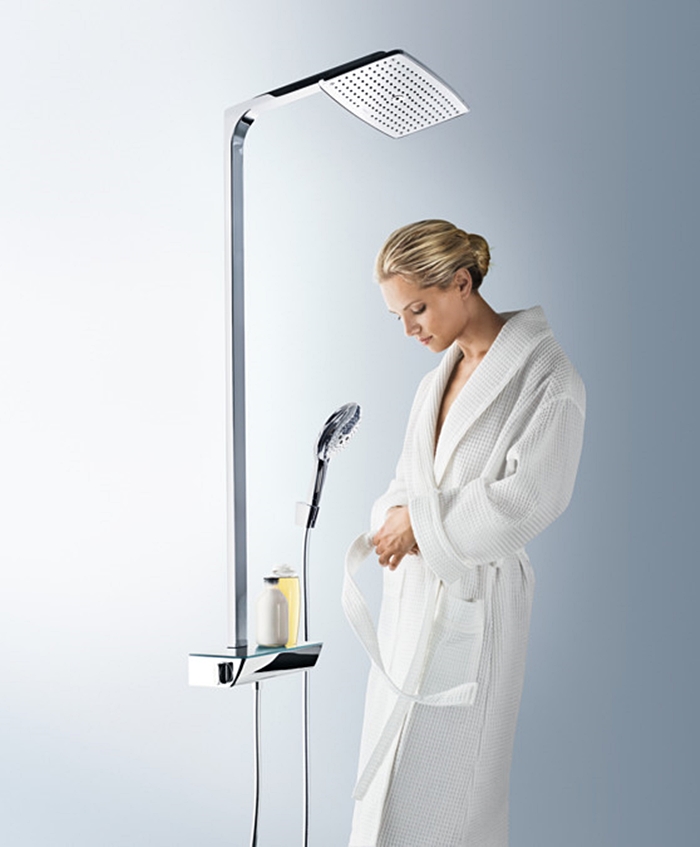 HANSGROHE Тип струменя: RainAir. Термостат Ecostat Select. Максимальні витрати води при 3 барах: 15 л/хв. Поличка з гартованого скла. Регульований кут верхнього душу.