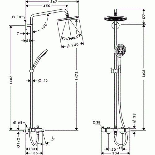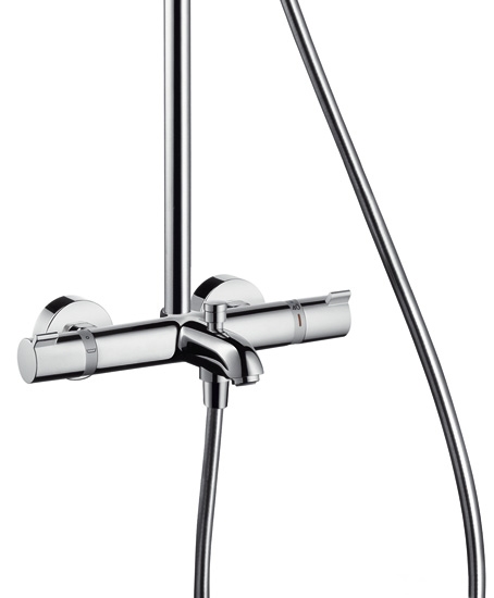 HANSGROHE складається з: верхній душ, ручний душ, термостат для ванни, душовий шланг, повзунок, душова штангаверхній душ Raindance S 240 Air, круглий, розмір верхньої душової лійки: 236х 236см, тип струменя: RainAirтермостат Ecostat Comfort, безпечна зупинка при 40°C, регульоване обмеження гарячої води