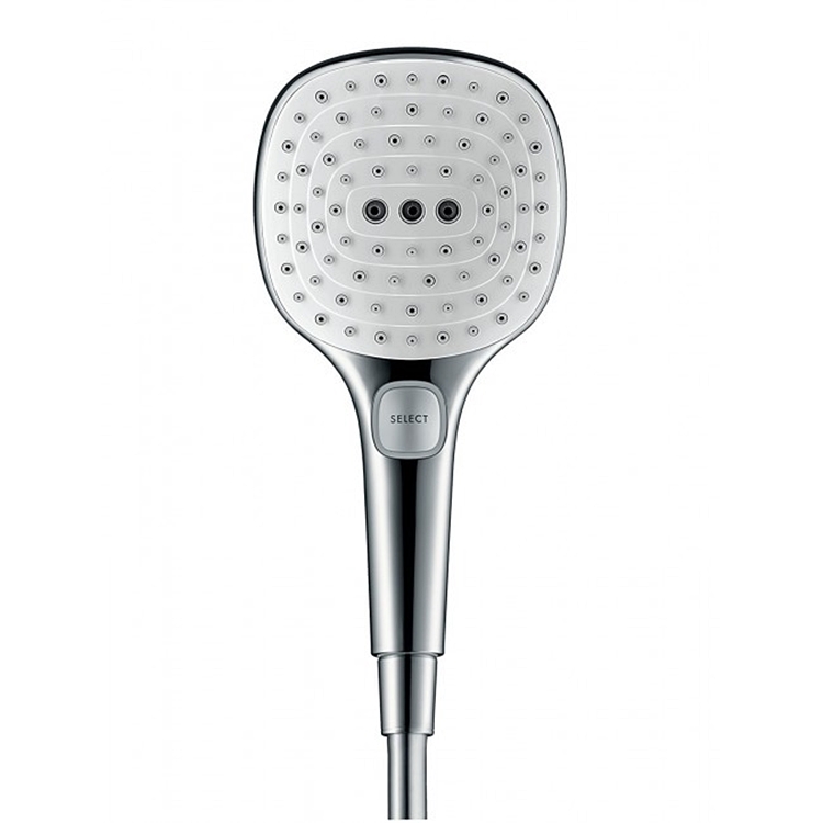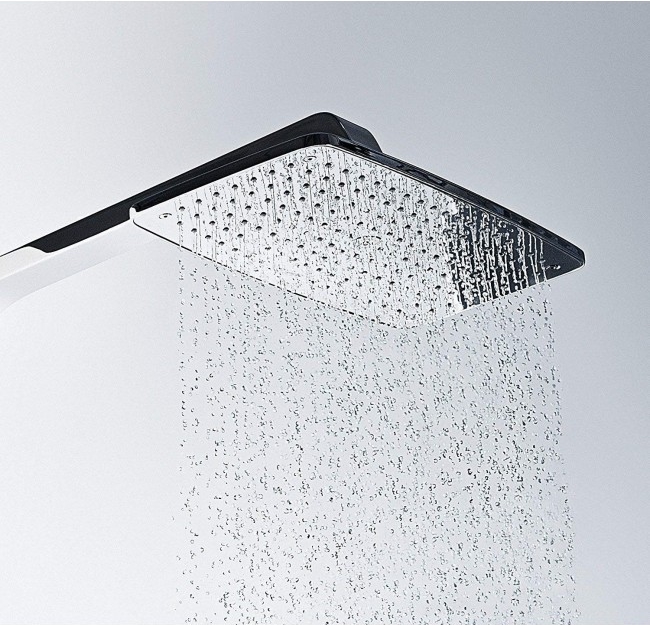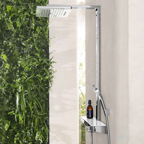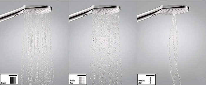 HANSGROHE 1 тип струменя з верхнього душу: RainAir. 3 типи струменів ручого душу: RainAir, Rain, Whirl. Поличка із захисного скла. Максимальна витрата води при 3 барах: 16,9 л/хв. Термостат CoolContact запобігає нагріванню корпуса термостата для більшої безпеки.