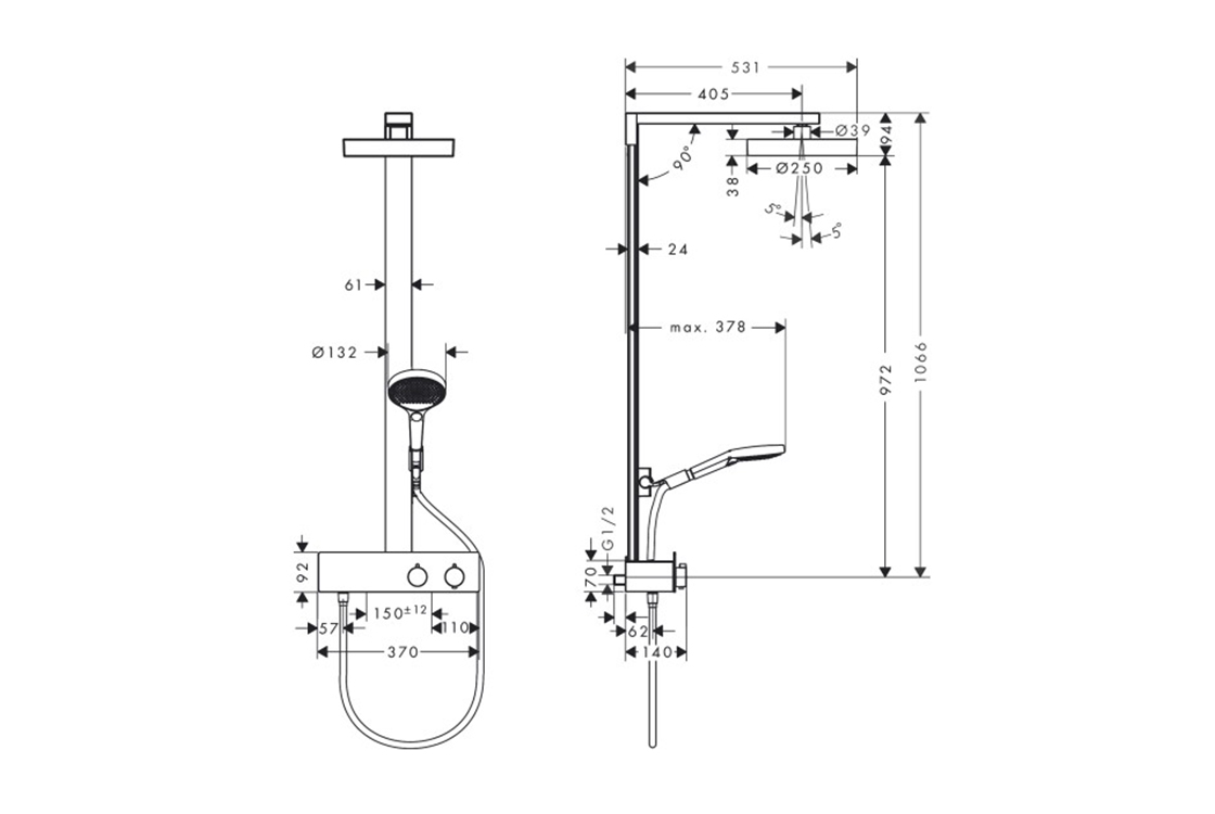складається з: верхнього душу, ручного душу, душового термостата, душового шланга, повзунка, душової штанги,2 функції,верхній душ Rainfinity 250 1jet (розмір душової лійки: 250 мм, тип розпилення: PowderRain, регулюється кут нахилу завдяки кульовомушарніру),тримач для ручного душу, регулюється на 90°, повертається вліво і вправо, вгору і вниз,поверхня розпилювального диска: графіт,поверхня полиці: анодований алюміній,тип розпилення ручного душу: PowderRain, Intense PowderRain, MonoRain,витрата ручного душу при 3 барах: 8,2 л/хв,макс. робочий тиск: 10 бар,ширина планки: 61 мм,термостат ShowerTablet 350,безпечна зупинка при 40°C,регульоване обмеження гарячої води,виходи, керовані за допомогою поворотної ручки,підходить для безперервних проточних водонагрівачів,приєднувальний розмір DN15,з'єднувальна різьба G ½,міжцентрова відстань 150 ± 12 мм,іскробезпечний проти зворотного потоку,довжина труби: 1000 мм.