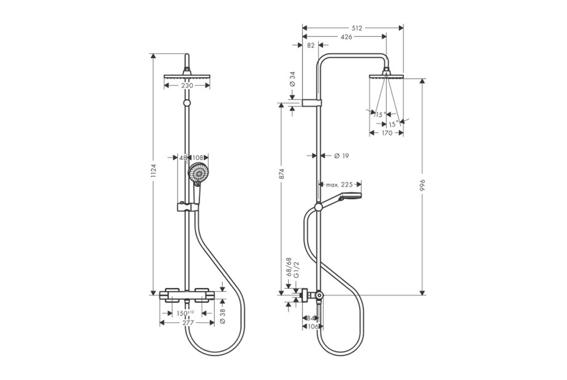 складається з: верхнього душу, ручного душу, душового термостата, душового шланга, повзунка, душової штанги,2 функції,верхній душ Vernis Shape 230 1jet (розмір душової лійки: 230x170 мм, тип розпилення: Rain, регулюється кут нахилу завдяки кульовомушарніру),регульований по висоті повзунок з кнопковим блокуванням,тип розпилення ручного душу: Rain, IntenseRain,максимальна витрата при 3 барах: 5,7 л/хв,витрата ручного душу при 3 барах: 5,5 л/хв,макс. робочий тиск: 10 бар,діаметр душової штанги: 19 мм,термостат Vernis,безпечна зупинка при 40°C,регульоване обмеження гарячої води,виходи, керовані за допомогою поворотної ручки,підходить для безперервних проточних водонагрівачів,приєднувальний розмір DN15,з'єднувальна різьба G ½,міжцентрова відстань 150 ± 12 мм,іскробезпечний проти зворотного потоку,довжина труби: 1124 мм.