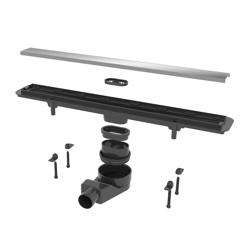 - комплектація: душовою канал - 1 шт, сифон - 1 шт, решітка для волосся 1 шт, ніверсальная двостороння накладка з нержавіючої сталі 1 шт, гідроізоляційні стрічки 4 шт, монтажний набір для кріплення регульованих ніжок: шуруп D 3,5x35мм - 4 шт., дюбель 6х35 мм - 4 шт, регульовані ніжки - 4 шт