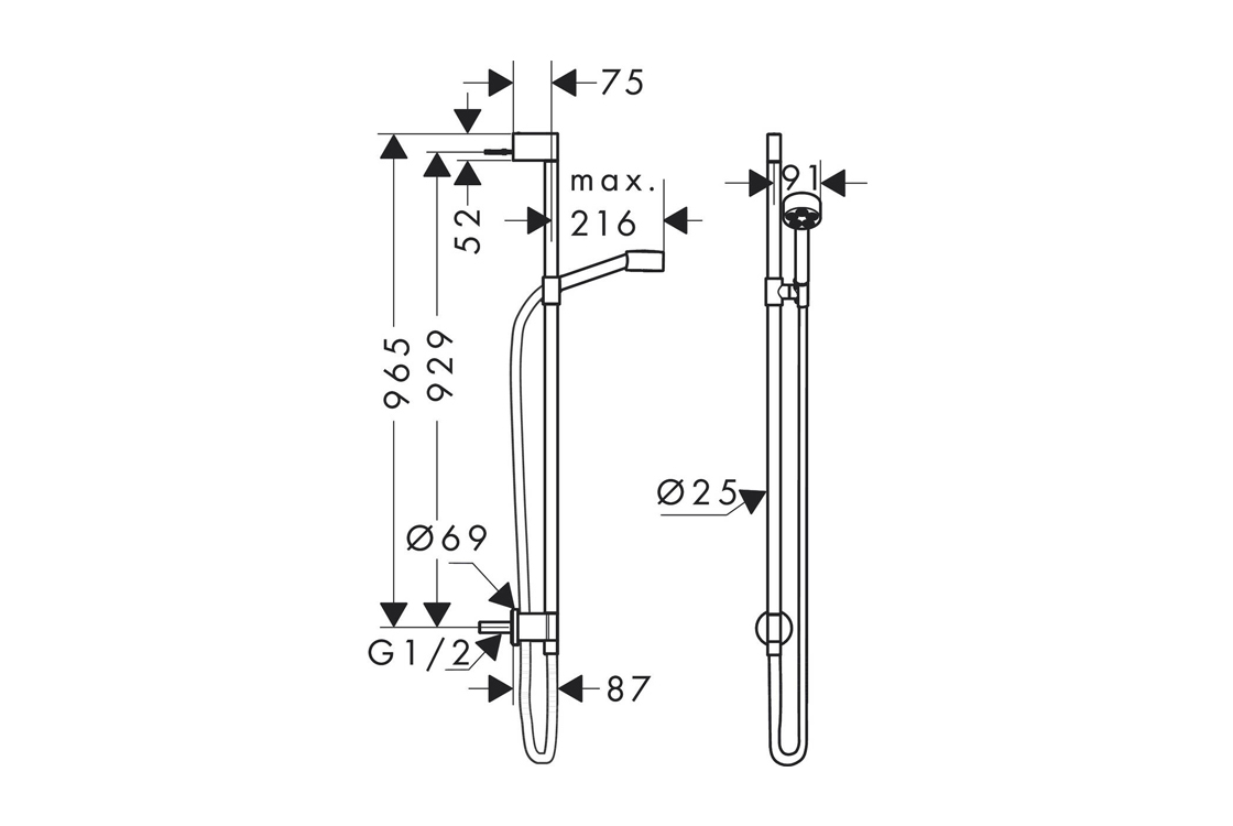 Axor складається з: ручного душу, душової штанги, душового шланга, повзунка, настінного з’єднувача,розмір душової лійки: 73 мм,тип розпилення: PowderRain,металевий тримач для ручного душу,довжина труби: 965 мм,діаметр душової штанги: 25 мм,максимальна витрата при 3 барах: 9,1 л/хв.