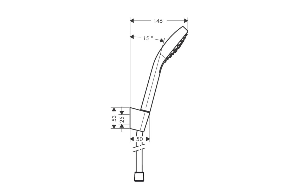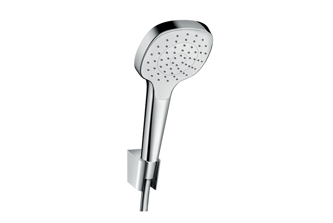 HANSGROHE складається з: ручного душу, тримача для душу, душового шланга,розмір душової лійки: 11 см,довжина шланга 125 см,інтегрована функція підтримки,тип розпилення: Дощ,максимальна витрата при 3 барах: 16 л/хв,мінімальний тиск потоку: 1 бар,поворотний з'єднувач запобігає заплутуванню шланга,душовий шланг з конусною гайкою на обох кінцях,тримач для душа з пластику,настінний монтаж: гвинтове кріплення,легка очистка лійки.
