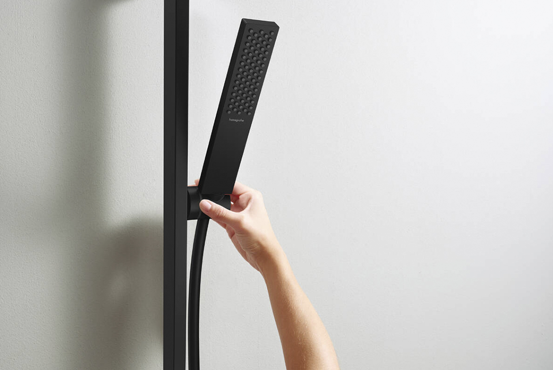 HANSGROHE складається з: душової штанги, душової лійки, душового шланга, тримача для душу,розмір душової лійки: 100х25 мм,тип розпилення: PowderRain,максимальна витрата при 3 барах: 5 л/хв,мінімальний тиск потоку: 0,9 бар,душовий шланг з конусною гайкою на обох кінцях,поворотний з'єднувач запобігає заплутуванню шланга,настінний монтаж: гвинтове кріплення,настінні опори з пластику,тримач ручного душу для правого та лівого встановлення,металевий тримач для ручного душу,довжина труби: 663 мм,профільна труба: куб,відстань свердління 627 мм,технологія EcoSmart+ (економне використання води).