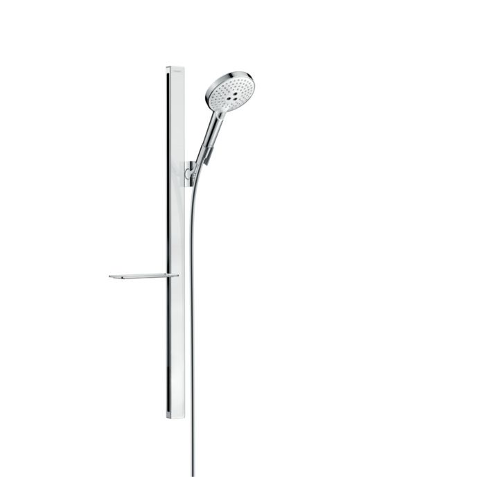 HANSGROHE 3 струмені: Rain, RainAir, Whirl. Максимальна витрата води при 3 барах: 9 л/хв. Настінні кріплення з пластику. Тримач ручного душу регулюється в межах 90°, повертається вправо і вліво, переміщується вгору і вниз. Перемикання струменів за допомогою кнопки Select.