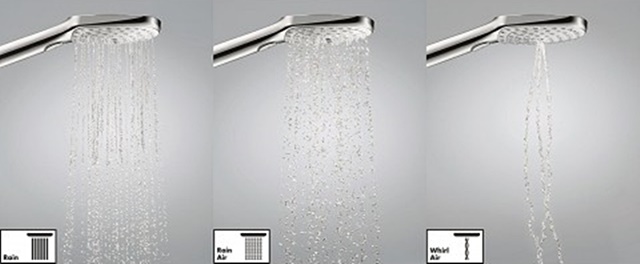 HANSGROHE 3 типи струменів: RainAir, Rain, WhirlAir. Зручне перемикання типів струменя за допомогою кнопки Select. Максимальна витрата води (при 3 бар): 15 л/хв. Хромовані настінні кріплення з пластику. З боку душу шарнірний підшипник, що запобігає перекручуванню душового шланга.