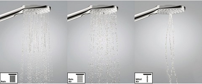 HANSGROHE 3 типи струменів: Rain, RainAir, Whirl. Тримач ручного душу регулюється в межах 90°, повертається вправо і вліво, переміщується вгору і вниз. Максимальні витрати води при 3 барах: 9 л/хв. Хромовані настінні кріплення з пластику. Душові струмені перемикаються за допомогою кнопки Select на лійці. Шланг не перекручується та не заломується, завдяки шарнірному з'єднанню.