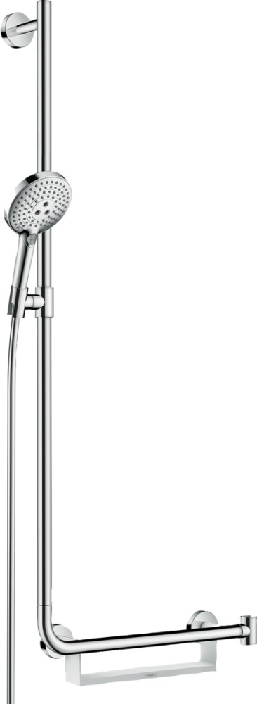 HANSGROHE 3 струмені: RainAir, Rain, Whirl. Максимальна витрата води при 3 бар: 15 л/хв. хромовані настінні кріплення з металу, поличка з білого пластику. Тримач для душу і поличку можна зняти.