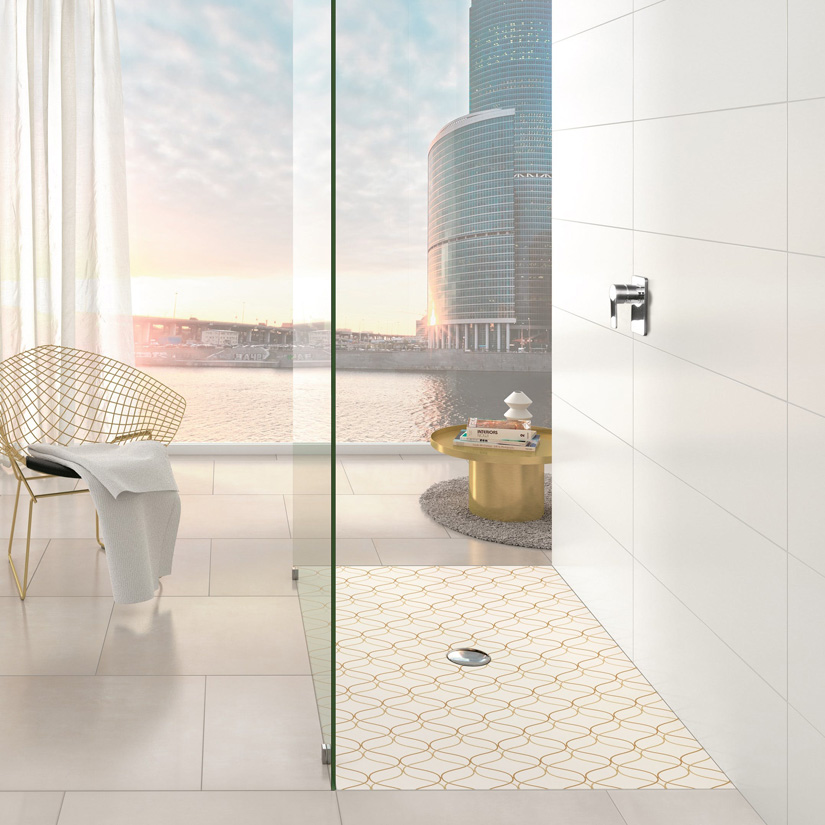 Ці душові піддони розрізаються на довгій стороні і повинні встановлюватися накладенням або в рівень з поверхнею (облицьовуватися плиткою) розрізаною стороною (сторони не глазуровані) до стіни. Зверніть увагу: положення зливу асиметрично - не по центру. Противоскользящий клас PN18.