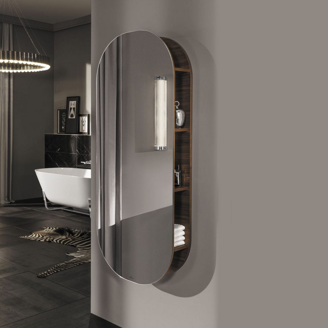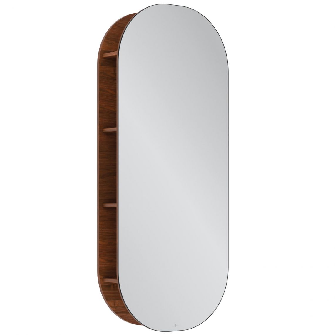 Дзеркало Villeroy & Boch Antheus (B30600PV) овальної форми і має з кожного боку по 4 полички для невеликих речей. Каркас виконаний з масиву дерева в кольорі American Walnut (горіх).