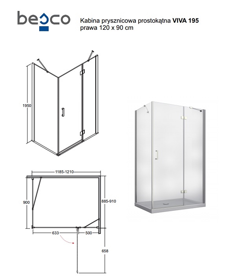 Кабіна прямокутна VIVA 120x90x195 права, скло прозоре, профіль хромований