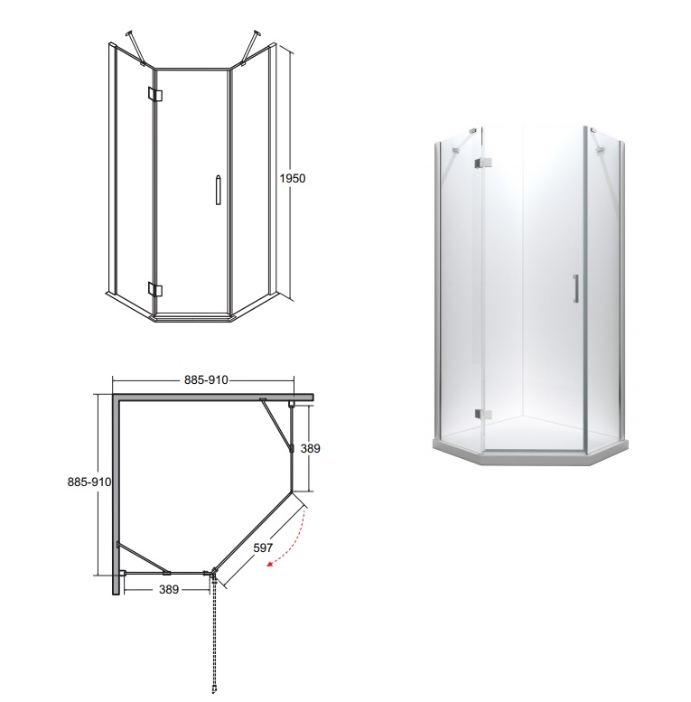 Кабіна п’ятикутна VIVA 90x90x195 права, скло прозоре, профіль хромований