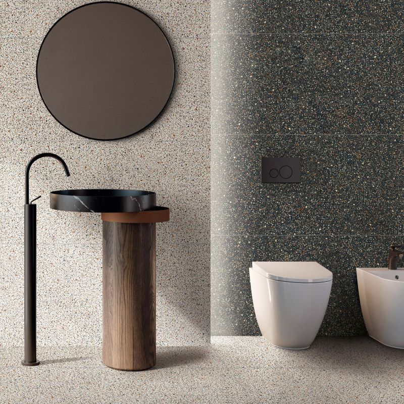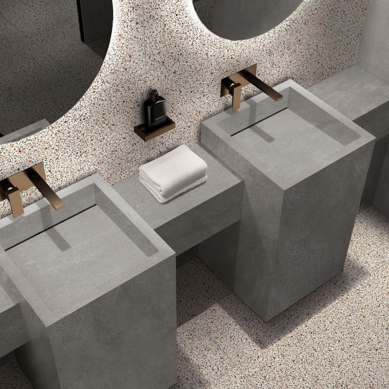 Керамограніт Blend промисловий ефект бетону поєднується з поліхромної текстурою венеціанських терас в рішуче сучасної композиційної суміші.