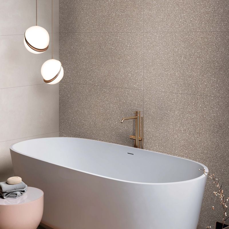Керамограніт Blend промисловий ефект бетону поєднується з поліхромної текстурою венеціанських терас в рішуче сучасної композиційної суміші.