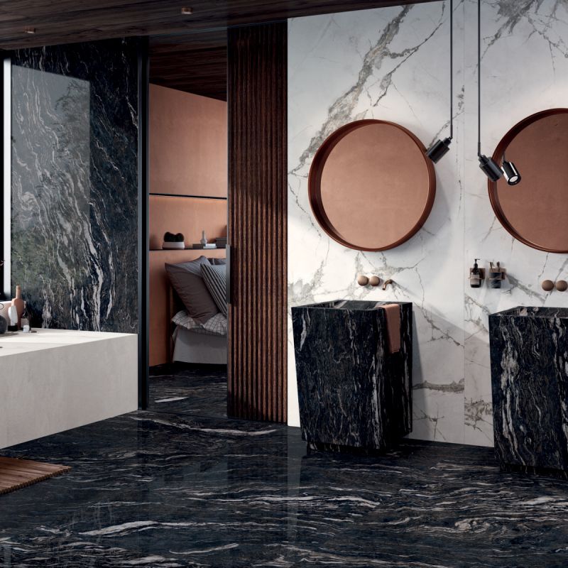 Колекції ABK для підлоги та стін, а також великі узгоджені модульні плити створюють відчуття безперервності між підлогою та стінами, а також між внутрішніми і зовнішніми просторами в житлових і торгових приміщеннях, таких як велнес, бізнес, Ho.Re.Ca і харчова промисловість.