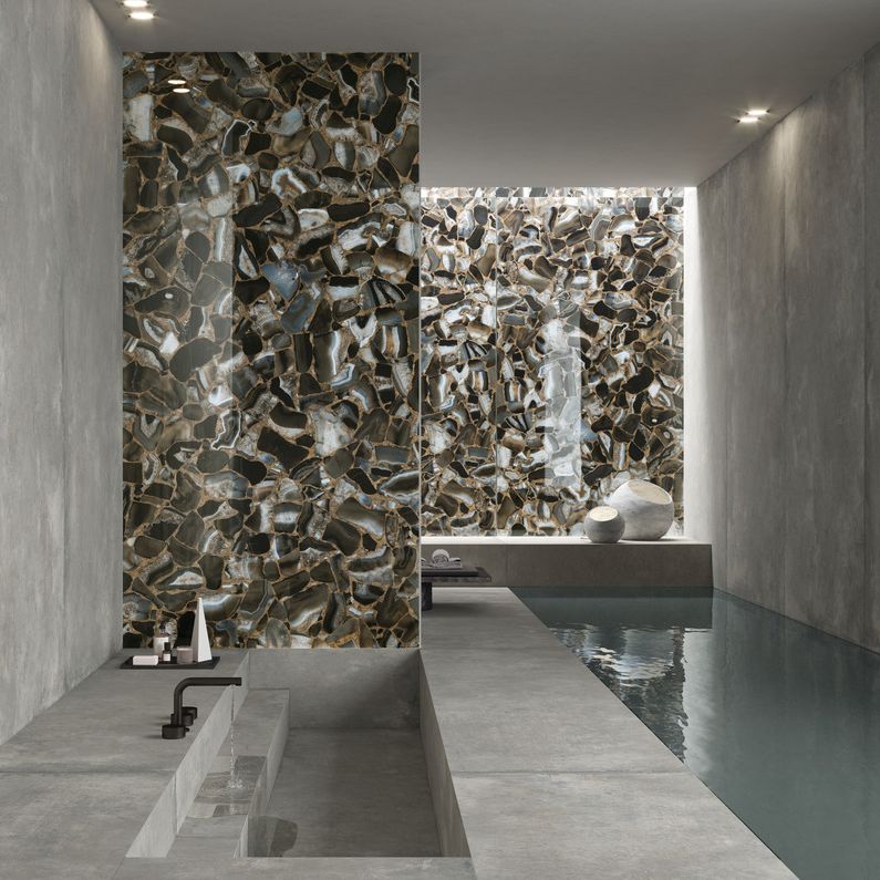 Керамограніт Ariostea представляє Ultra Agata, нову колекцію, названу на честь твердого каменю, на який вона натхненна і відтворюється з дивовижною точністю. Неправильні смуги, часто концентричні і контрастують один з одним, створюють поверхню з сильною декоративної цінністю, де напівпрозорість, глибина і непрозорість зливаються в континуумі перекриваються квітів. Колекція доступна в 3 яскравих яскравих відтінках, які досліджують відтінки чорного, коричневого та синього відповідно, а обробка Lucidato Shiny підкреслює поверхню і додає яскравості, підкреслюючи відтінки кольору.