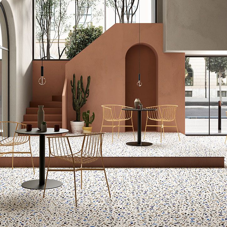 Варіант «терраццо» з тонким або товщим фоном, з можливістю поєднання великих і малих розмірів для створення надзвичайно сучасного вигляду з потужним декоративним чарівністю.