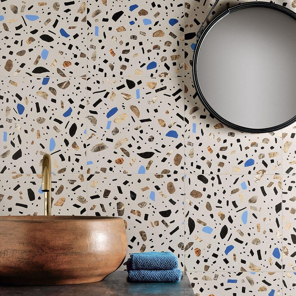 Варіант «терраццо» з тонким або товщим фоном, з можливістю поєднання великих і малих розмірів для створення надзвичайно сучасного вигляду з потужним декоративним чарівністю.