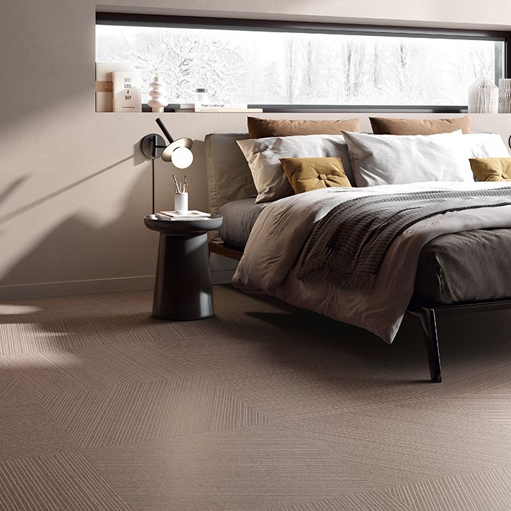 Керамограніт Tweed Stone ми досліджували красу і силу лавового каменю, і його мінливі структури, що перетинаються нюансами кольору, сформували фон для інноваційних підлог всередині приміщень. Ми доповнили його природні вібрації м'якою тканиною.