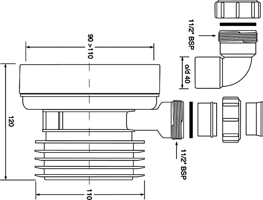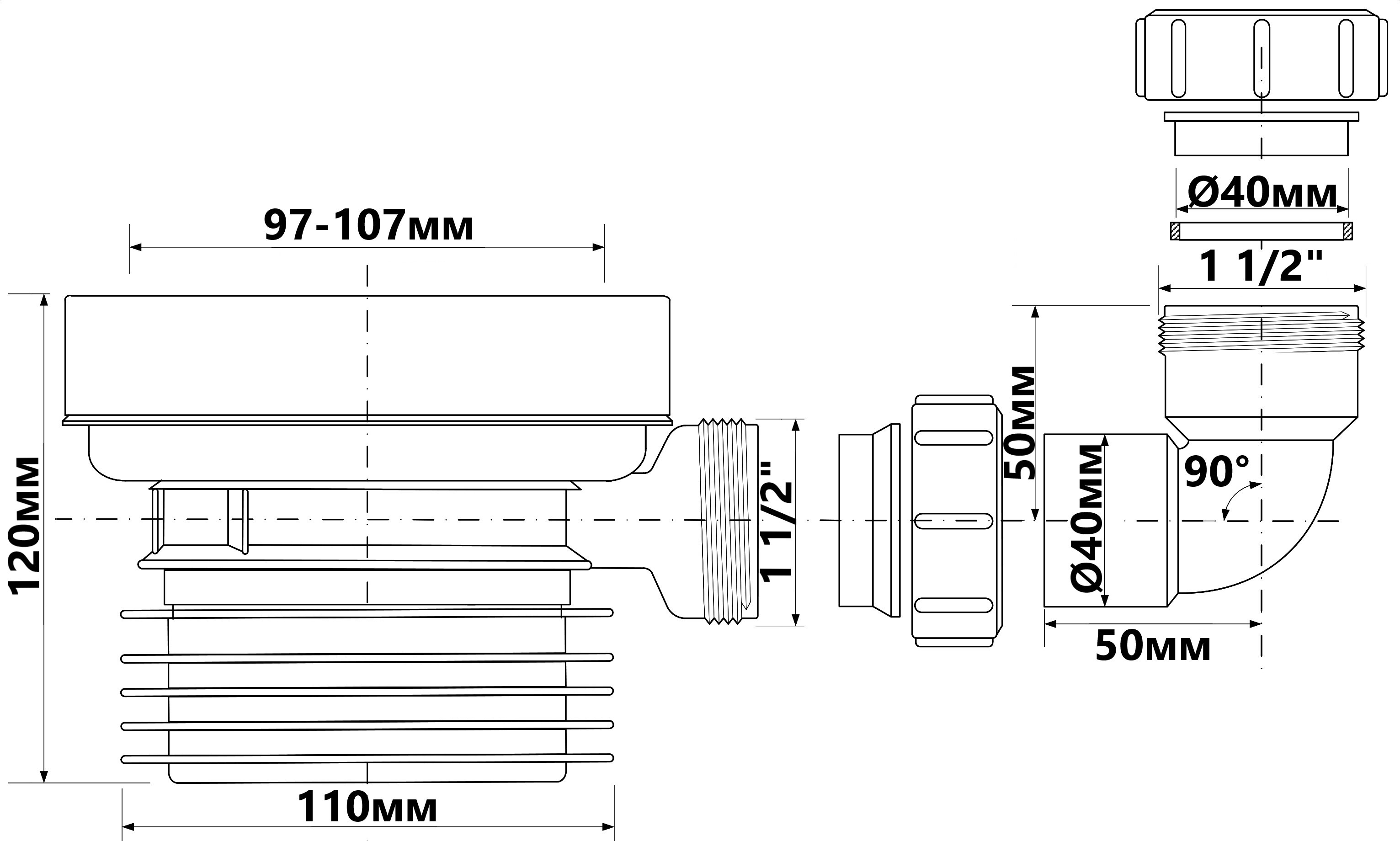 Коліно-підключення до WC коротке 120 мм. просте, з отвором 40 мм WC-CON1D