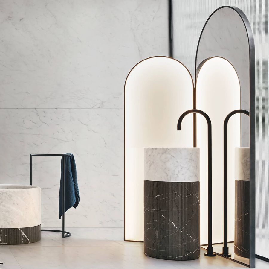 - раковина для підлоги ROMA III Ø45 x h88 см, слив в підлогу, без отвору, c донним клапаном, гладкий фрезерований мармур, колір: bianco carrara-A10L / grafite-A51F