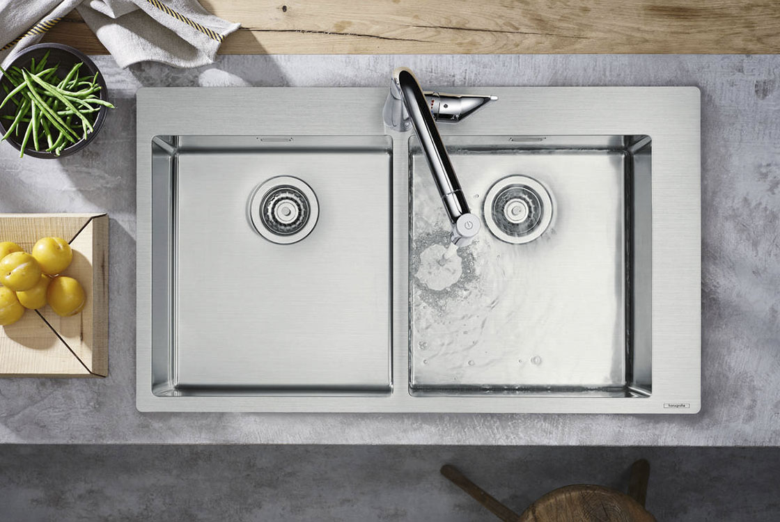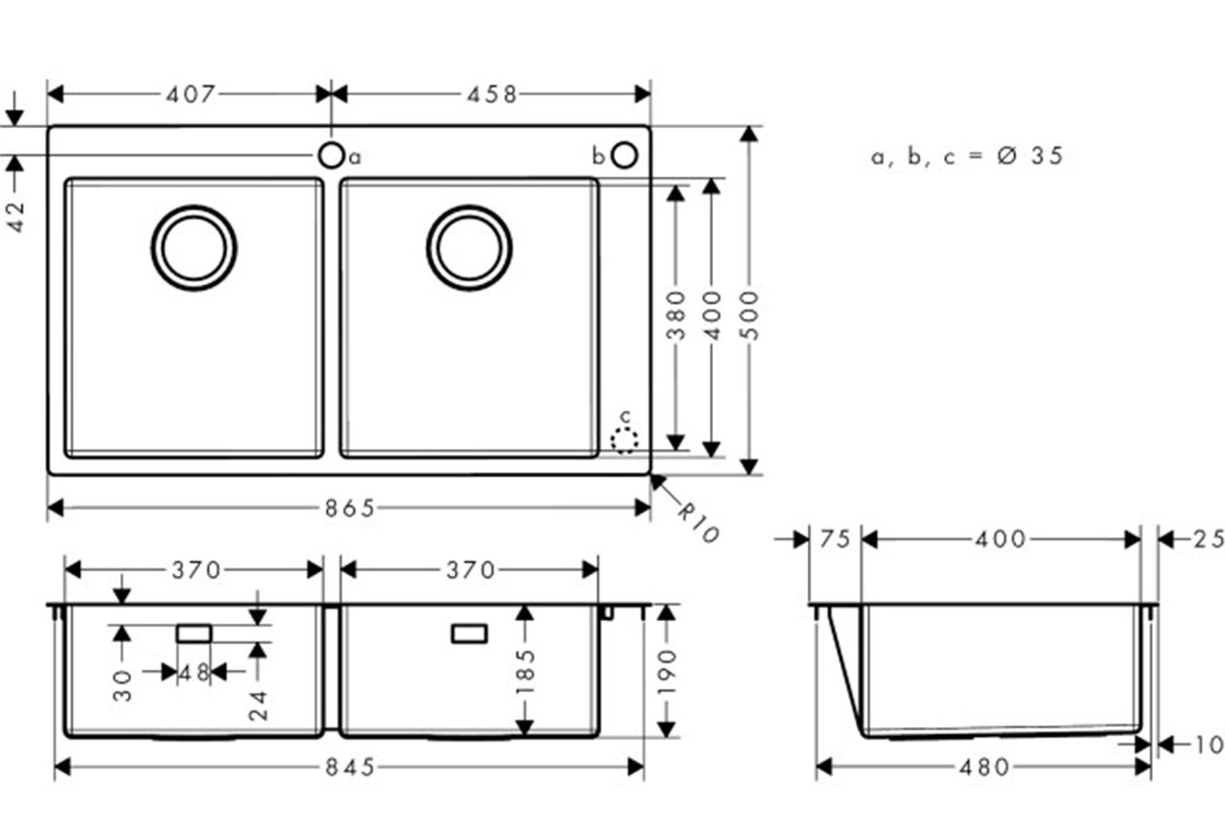 розмір: 865x500 мм,2 основні чаші,тип монтажу: плаский на стільницю (самообрамлення) або врізний монтаж,глибина раковини: 190 мм,радіус кута: 10 мм,необхідне додаткове обладнання: сифон D15-10 з переливом для мийки зі сталі на дві чаші (арт.43922800) Stainless Steel (не входять в комплект).