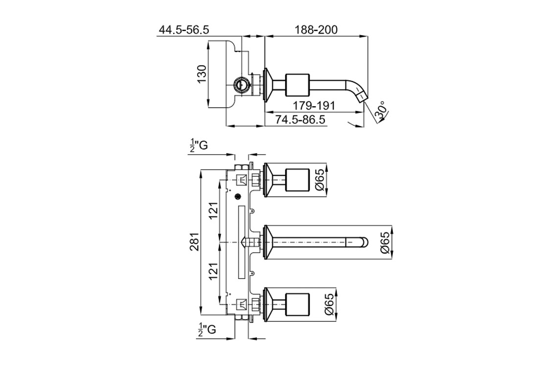LIGNAGE CARRARA – Змішувач прихованого монтажу для умивальника на 3 отвори, настінний з керамічним картириджем. З'єднання 1/2”, без клапана зливу з аератором “plus”. Пропускна здатність при 3 барах 5 л/хв.