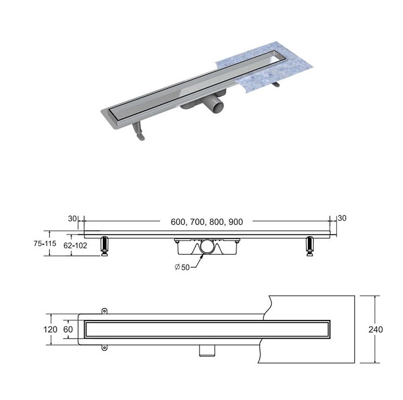 Розмір: 70x6 см.- низька монтажна висота (62 мм від фланця)- підключення Ø 50 мм- пропускна здатність сифона до 56 л/хв- сифон очищується зверху- решітка 2-в-1: матовий хромований покрив або для монтажу з керамічною плиткою.