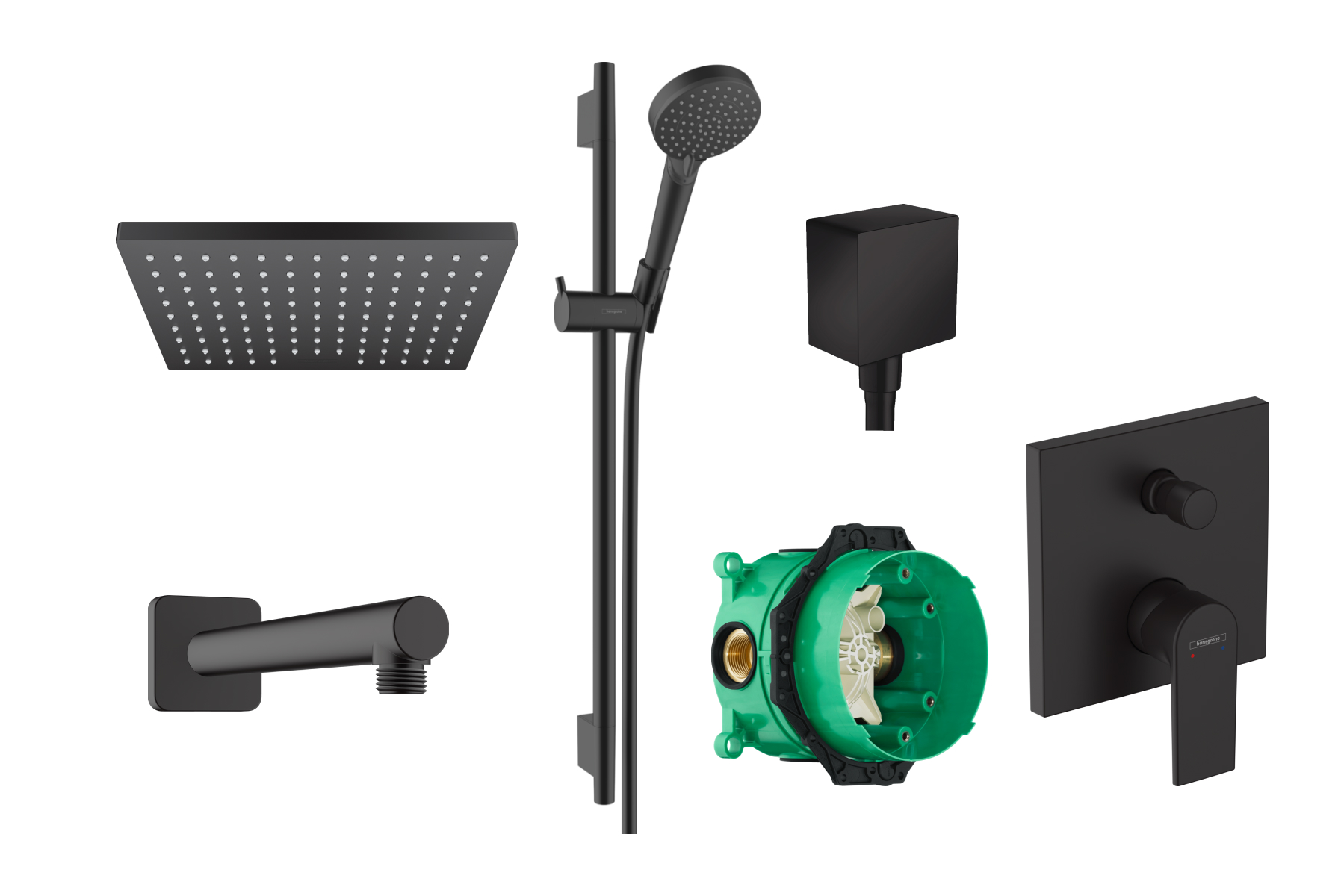 В комплекті:Змішувач Vernis Shape прихованого монтажу для ванни/душу, верхня частина, Matt Black (71468670), максимальна витрата при 3 барах: 29 л/хв,Прихована частина для змішувачів Ibox universal (01800180),Душовий набір Vernis Blend Vario EcoSmart S Puro 65 см, Matt Black (26423670), складається з: ручного душу, душової штанги, душового шланга, повзунка, максимальна витрата при 3 барах: 9,7 л/хв,Шлангове під’єднання FixFit Matt Black (26455670),Верхній душ Vernis Shape 230 230x170 мм 1jet EcoSmart, Matt Black (26283670), максимальна витрата при 3 барах: 8,7 л/хв,Кронштейн для верхнього душу Vernis Shape 240, Matt Black (26405670).