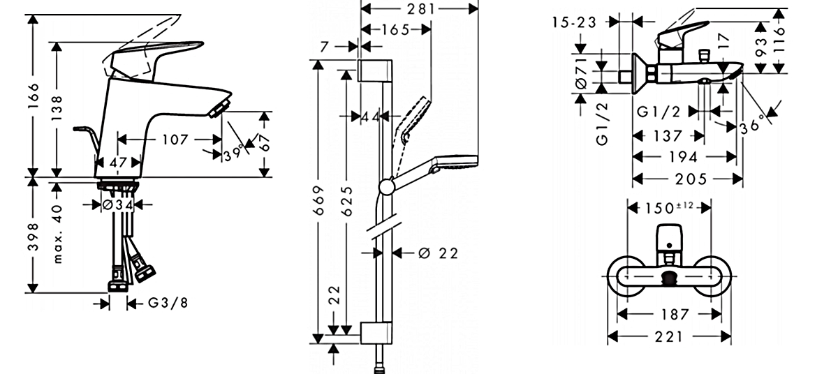 В комплект входить:Душовий набір Crometta Vario 0.65м EcoSmart 9л/хв: білий/хромований (26534400) складається з: ручного душу, душової штанги, душового шланга, повзункаЗмішувач Logis 70 для умивальника LowFlow 3.5 л/хв з донним клапаном (71078000)Змішувач Logis для ванни (71400000)Витрата води для змішувача для умивальника при 3 барах: 3.5 л/хв. Кут нахилу тримача ручного душу регулюється на 45°. Максимальна витрата води з ручного душу (при 3 барах): 9 л/хв.Хромовані настінні кріплення з пластику.