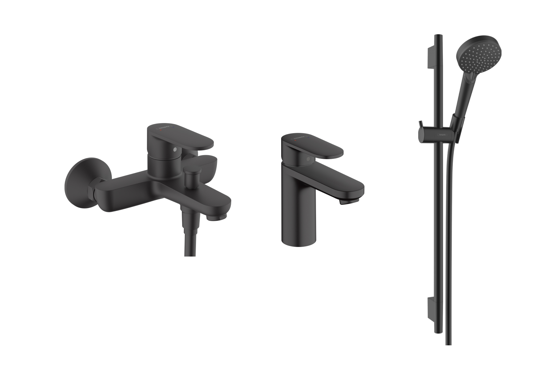 В комплекті:Змішувач Vernis Blend 100 для умивальника з донним клапаном pop-up, Matt Black (71551670), максимальна витрата при 3 барах: 5 л/хв,Змішувач Vernis Blend для ванни, Matt Black (71440670), максимальна витрата при 3 барах: 22,5 л/хв,Душовий набір Vernis Blend Vario EcoSmart S Puro 65 см, Matt Black (26423670), складається з: ручного душу, душової штанги, душового шланга, повзунка, максимальна витрата при 3 барах: 9,7 л/хв.