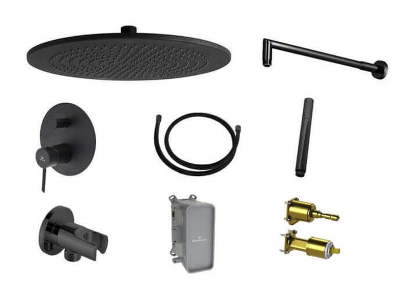 В комплект входить:верхній душ Rondo діаметром 30 см(100213249),кронштейн для верхнього душу (100213248),зовнішня частина змішувача для душу (100210625),внутрішня частина змішувача (100107958),ручний душ (100213256),настінний тримач (100213266),шланг для душу (100215377).