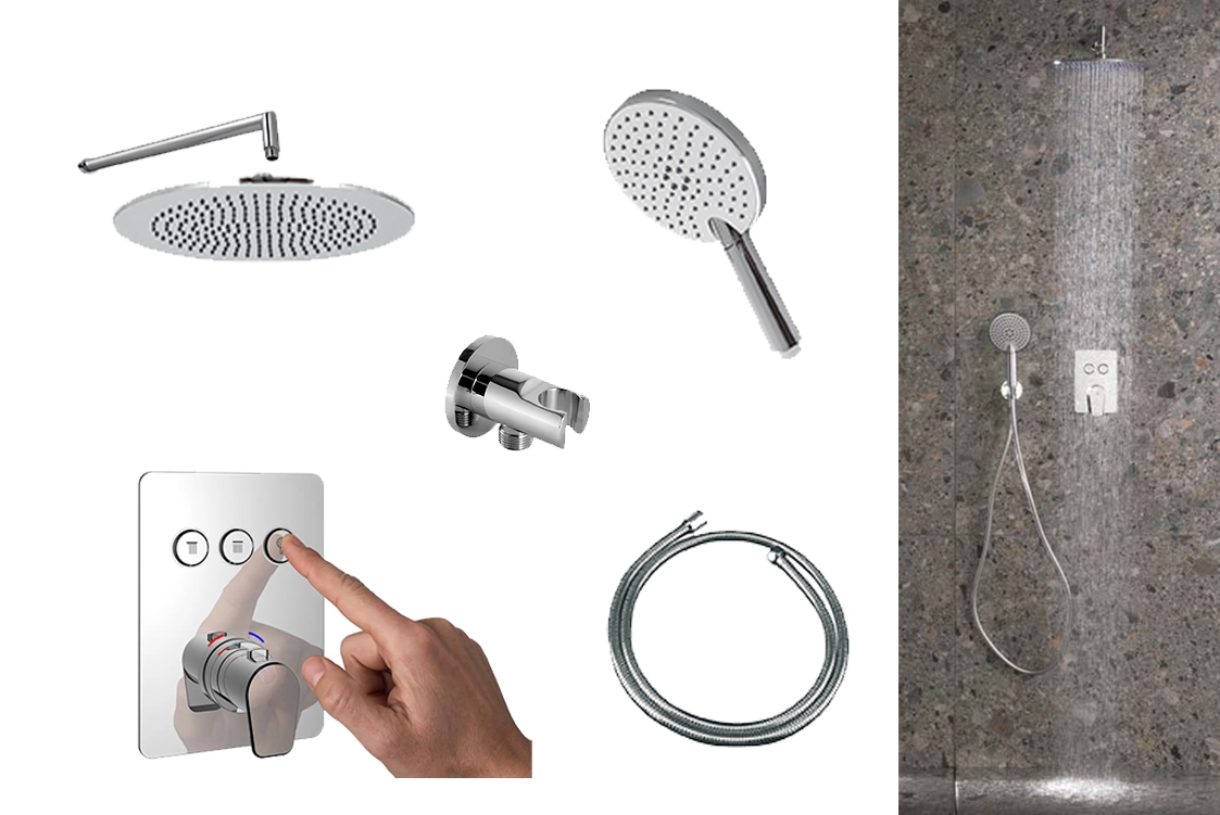 В комплект входить:верхній душ овальний 30х20 см (100090355),кронштейн для верхнього душу (100063878),термостат з кнопками (100243881),ручна лійка (100180987),настінний тримач (100039121),шланг для душу (100137893).