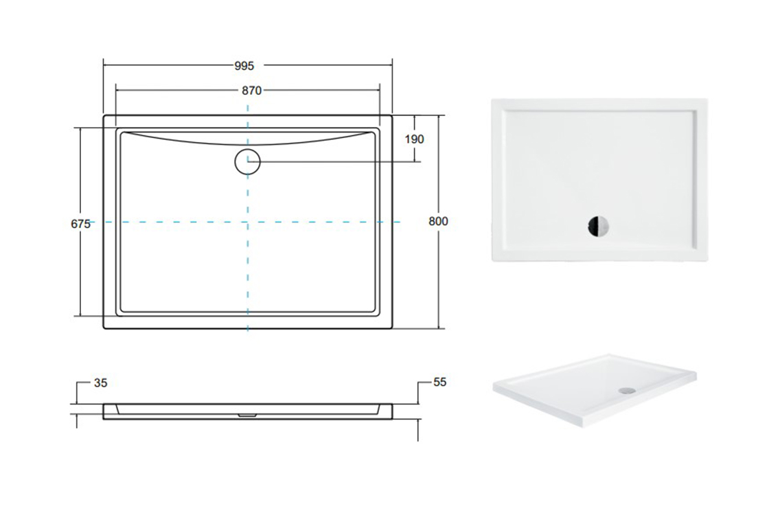 Довжина піддона 100 мм., ширина - 800 мм., висота - 55 мм., глибина - 30 мм., а діаметр отвору для зливу - 90 мм.