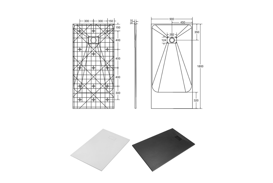 Піддон VEXO білого кольору в комплекті з сифоном. Підходить до прямокутних душових кабін.