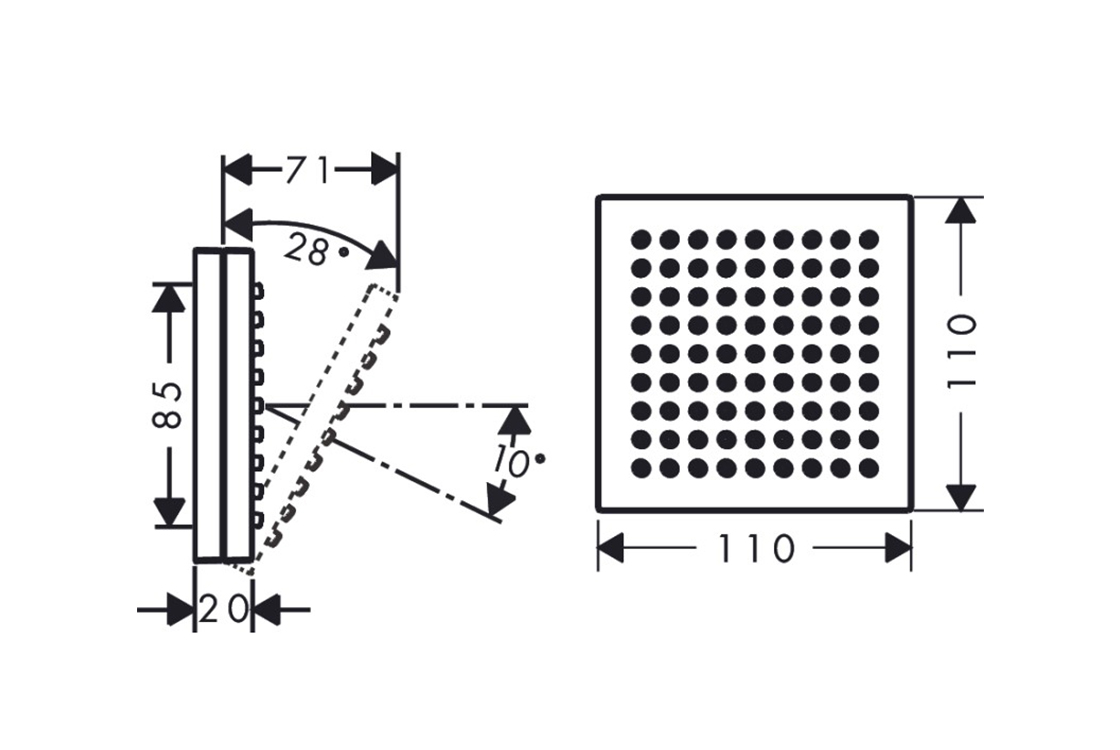 розмір душової лійки: 110х110 мм,тип розпилення: PowderRain,кут нахилу душу регулюється (2 варіанти),розетка: кутова,підходить для проточних водонагрівачів,приєднувальний розмір: DN15,необхідне додаткове обладнання: прихована частина для монтажу душу зі стіни 2jet (арт.35361180) (не входить в комплект).