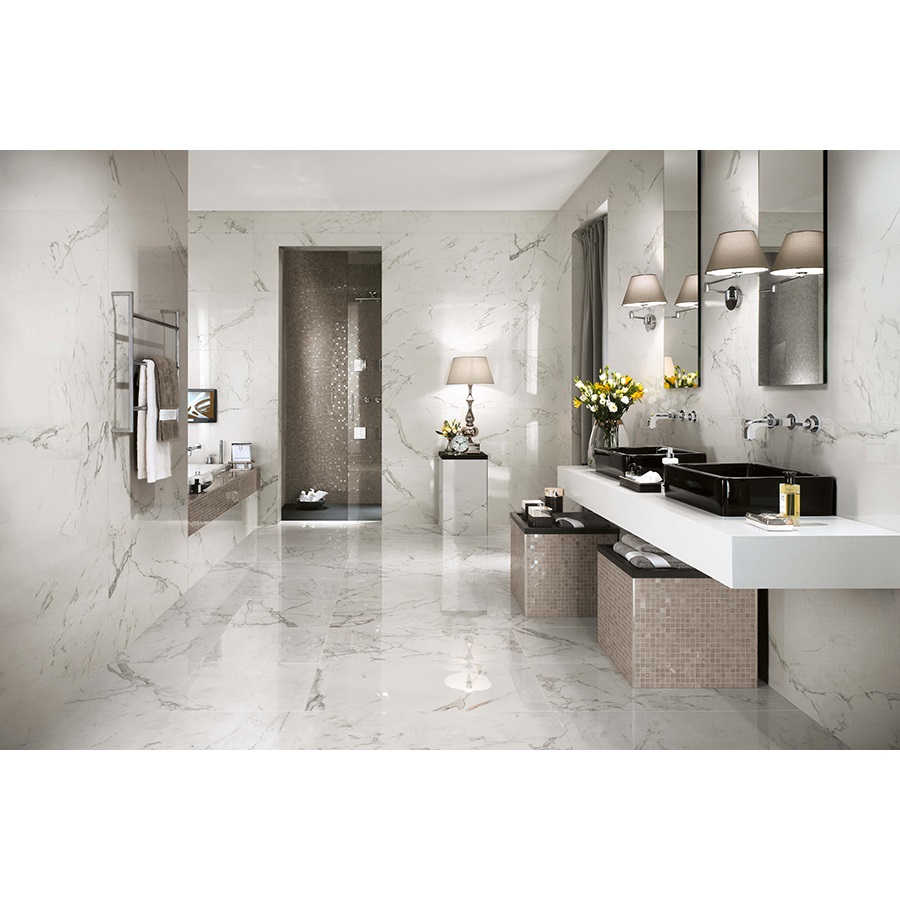 Проект, навіяний видом цінних порід мармуру, включає підлоговий керамограніт і настінну плитку, чия фактура з максимальною точністю передає багатий малюнок вихідних природних зразків.