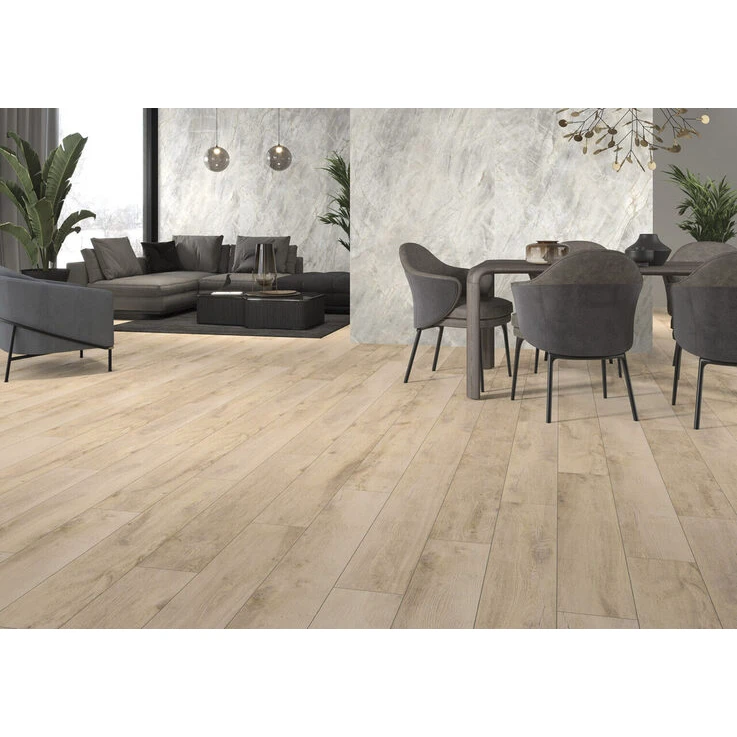 Cerrad Керамогранітна плитка Guardian Wood Light Beige RECT від Cerrad розміром 193x1202x8 мм поєднує теплий світло-бежевий відтінок і текстуру натурального дерева, створюючи затишний та сучасний інтер'єр. Плитка підходить для укладання на підлогу або стіни, додаючи простору природності. Завдяки високій міцності, стійкості до зносу, вологи і механічних пошкоджень, вона забезпечує тривалу експлуатацію навіть у приміщеннях з високим навантаженням. Простота догляду робить її ідеальним рішенням для будь-якого інтер'єру.