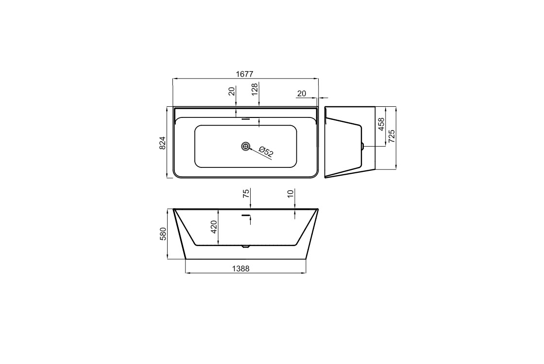 Ванна вільностояча, прямокутна 168×82, цільна, злив по центру, сантехнічний акрил.